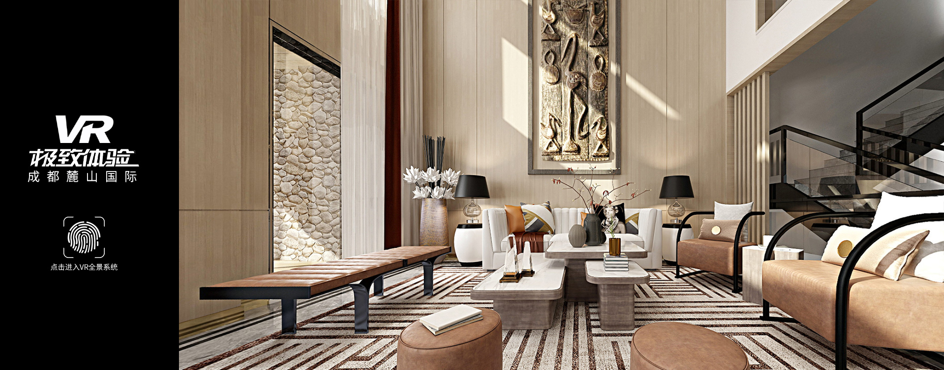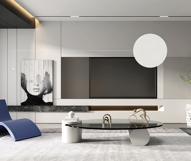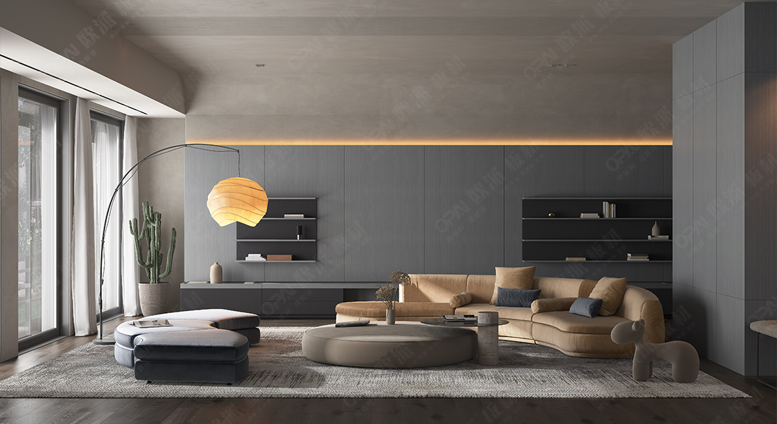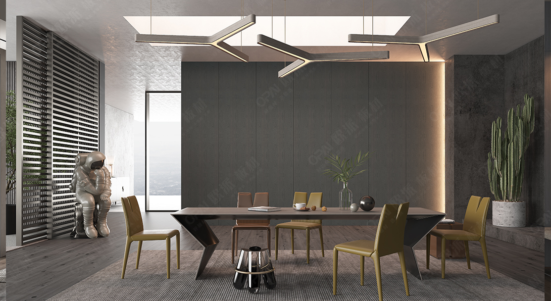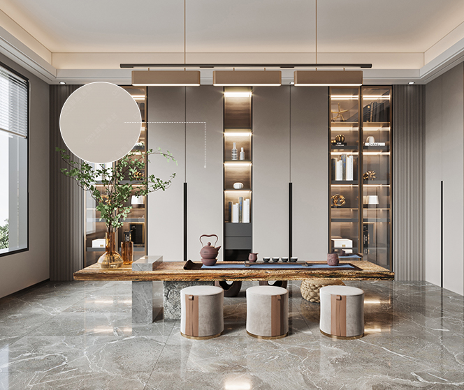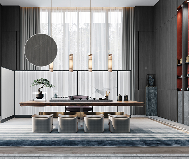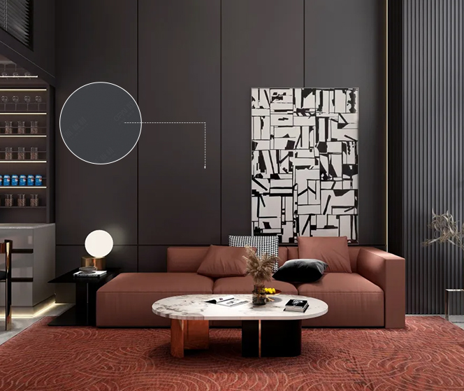 本案色調以灰色為主,配色融入了東方美學朱砂紅為室內增添一抹活躍的色彩,碰撞出兼具現實與復古風味的視覺感受,以此喚起一場新時代的設計變革。