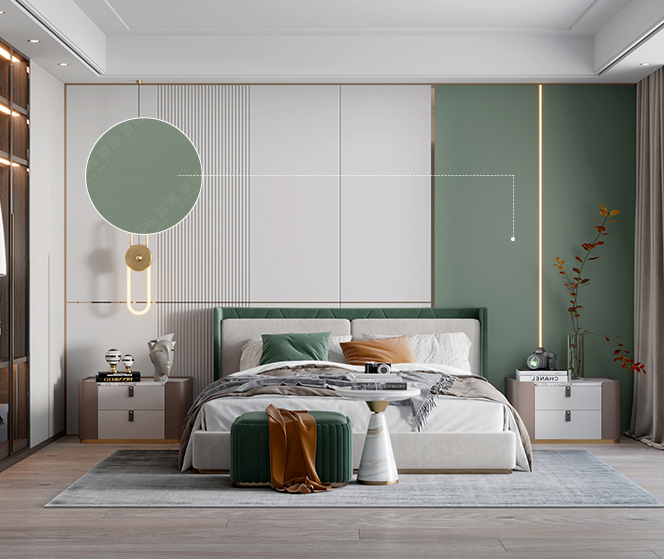 本案中豆沙綠色是讓人內心感覺平靜的色調,可以中和白色清涼與無暇令人感到十分自由,令人心胸開闊,居室空間似乎像河流的潺潺細語。這樣的搭配給予空間一種新的生命。