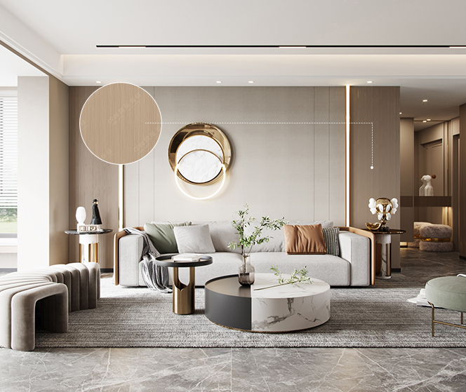 本案設計以輕奢現代風格為主,奶油色系柜體,局部的金屬元素,淺色石材,無一不是對于整體空間氣質的提升,營造出簡奢的低調和設計感。整體空間高級感油然而生。